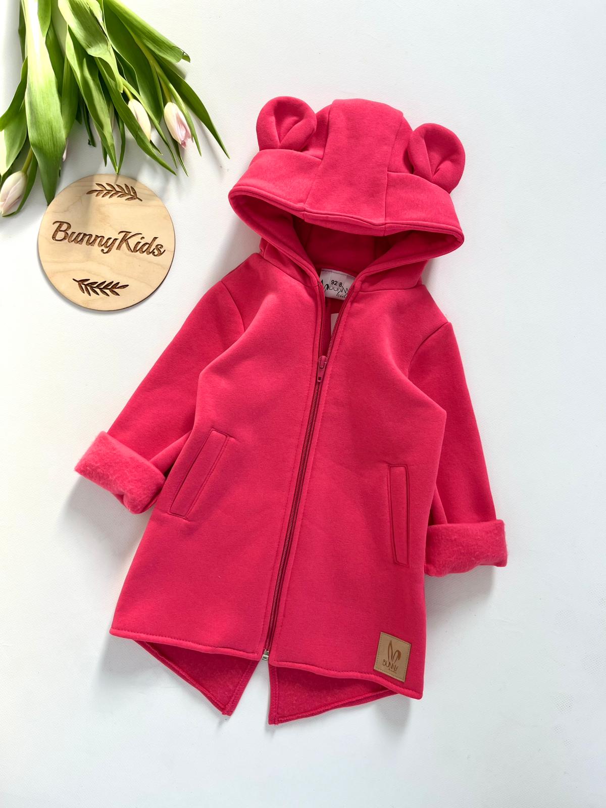 Stylový hřejivý mikino-kabátek s oušky Medvídek od Bunnykids – barva JAHODOVÁ: