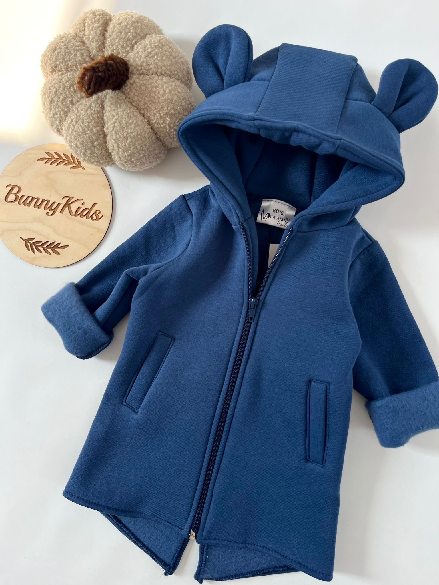 Stylový hřejivý mikino-kabátek s oušky Medvídek od Bunnykids – barva JEANS: