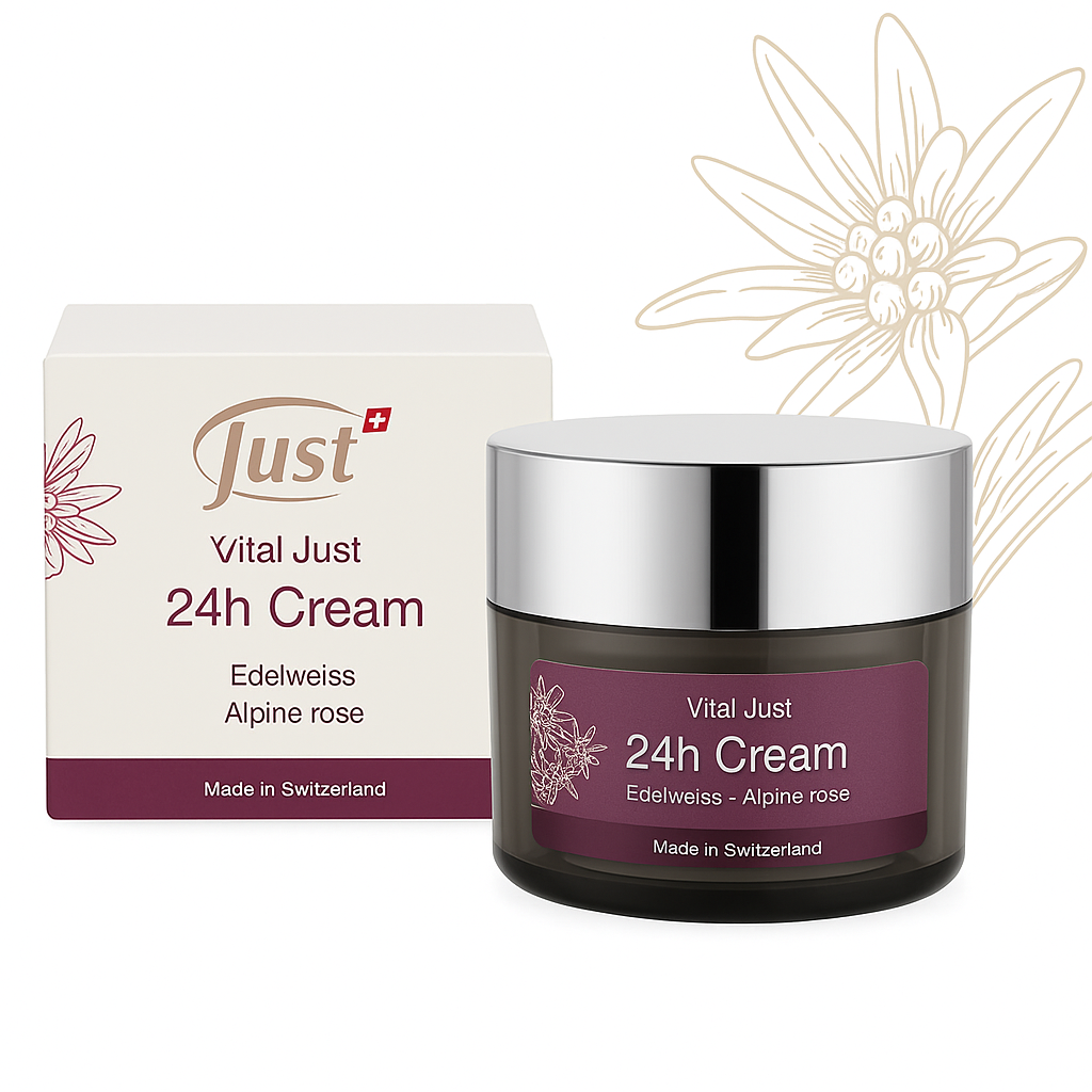 JUST VJ 24h je oblíbený regenerační krém pro denní i noční péči. JUST VJ 24h poskytuje bohatou péči po celý den a podporuje regenerační procesy během noci. Obsažené složky pomáhají výrazně zmírňovat projevy stárnutí pleti.